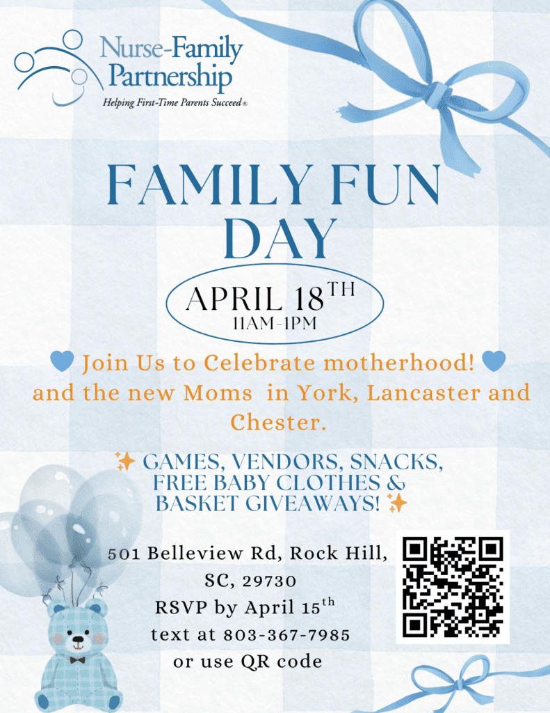 If you are a first time mother, or know of a first time mother that may benefit from our Nurse-Family Partnership Program, please call 803-981-5780, or email at nfp@ycfirststeps.com.